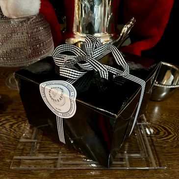 Cakes are delivered in chic black boxes tied with black and white gingham ribbon.
